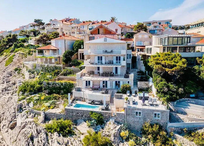 Blue Views Villa With Heated Pool & Jacuzzi i Dubrovnik er en 5 værelses indkvartering med en terrasse og udsigt over havet. Der er et udstyret køkken og 5 badeværelser.
